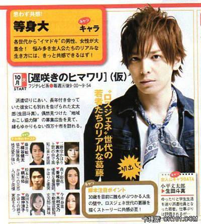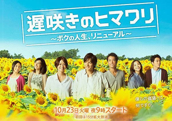 2012年10月期的富士台周二21點播出的電視連續劇,是由生田斗真主演的《遲開的向日葵~我的人生 重新開始~》。以被稱作“最后的清流”的高知縣四万十川為舞台,描繪了雖然對將來的夢想充滿迷茫與不安,卻仍掙扎著度過一成不變的平凡生活的7位年輕男女的身影。是會令人懷念卻又新穎的群像劇。女主角是真木陽子。共演的是桐谷健太、香椎由宇、柄本佑、木村文乃,以及國仲涼子等同一代的充滿個性的演員。真實描繪如今在日本常見的年輕人的普通的日常生活。